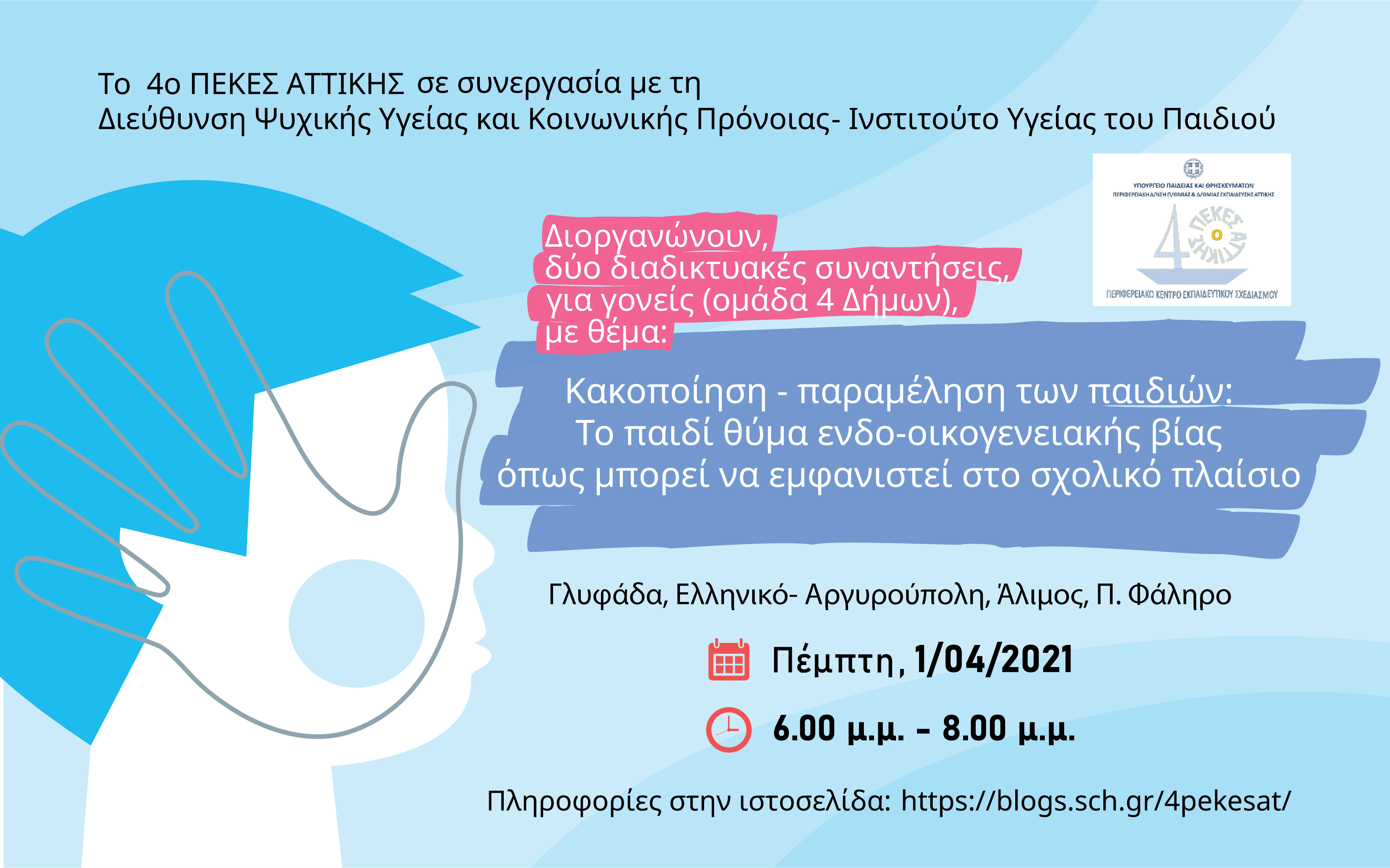 Το 4ο ΠΕΚΕΣ Αττικής σε συνεργασία με τη Διεύθυνση Ψυχικής Υγείας και Κοινωνικής Πρόνοιας-Ινστιτούτο Υγείας του Παιδιού, ξεκινά έναν κύκλο προαιρετικών επιμορφωτικών συναντήσεων, με θέμα: